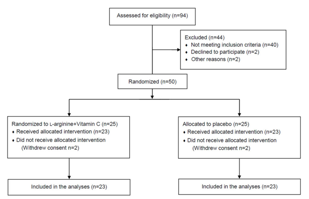 Din cei 94 de participanți candidați examinați, 50 (53,2%) au îndeplinit criteriile de includere și au fost de acord să fie randomizați pentru a primi fie intervenția L-arginină plus vitamina C (n = 25) fie placebo (n = 25). Doi participanți din fiecare grup și-au retras consimțământul înainte de a primi intervenția alocată și nu au fost incluși în analiză (Figura 1).