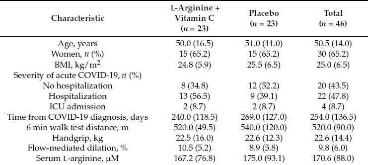 Participanții au avut o vârstă medie (IQR) de 50,5 (14,0) ani și erau predominant femei (65,2%). Aproximativ jumătate dintre participanți au avut nevoie de spitalizare în timpul episodului acut de COVID-19, iar patru (8,7%) au fost internați la UTI. Timpul mediu (IQR) care a trecut de la diagnosticarea COVID-19 până la includerea în studiu a fost de 254,0 (136,5) zile. Distanța mediană (IQR) parcursă la testul de mers pe jos de 6 minute a fost de 520 (90) m, în timp ce rezistența gripului a fost de 22,6 (14,4) kg. Dilatarea mediată de flux la momentul inițial a fost de 9,8%. Concentrația serică mediană (IQR) de l-arginină a fost de 170,6 (88,0) µM, fără diferențe între grupurile de intervenție. Cu toate acestea, valorile l-argininei serice au fost mai mici decât cele observate în eșantion fără dovezi ale infecției anterioare cu SARS-CoV-2 (mediana (IQR) 222,1 (23,1) µM; p = 0,04). La 28 de zile, concentrațiile serice de l-arginina au crescut mai mult la participanții care au primit suplimente cu L-arginina plus vitamina C (+60,2 (85,8) µM) decât în grupul placebo (+11,0 (90,8) µM; p = 0,02; diferență medie 62,4 µM, interval de încredere 95% (CI): 11,1–113,7 µM dimensiunea efectului = 0,72) (Figura 2); După 28 de zile de suplimentare cu l-arginina plus vitamina C, nivelurile serice de l-arginina din grupul activ (222,8 (88,6) µM) au fost comparabile cu cele ale controalelor fără infecție anterioară cu SARS-CoV-2 (p = 0,8).