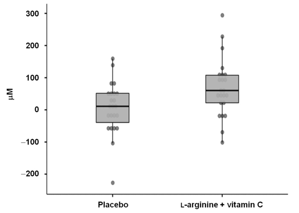 Dilatarea mediată de flux a fost mai mare la participanții care au primit L-arginina plus vitamina C, comparativ cu placebo (14,3% (7,3) vs. 9,4% (5,8), p = 0,03; diferența medie = 3,4%; 95% CI: 0,4– 6,5; dimensiunea efectului = 0,66) (Figura 4B).