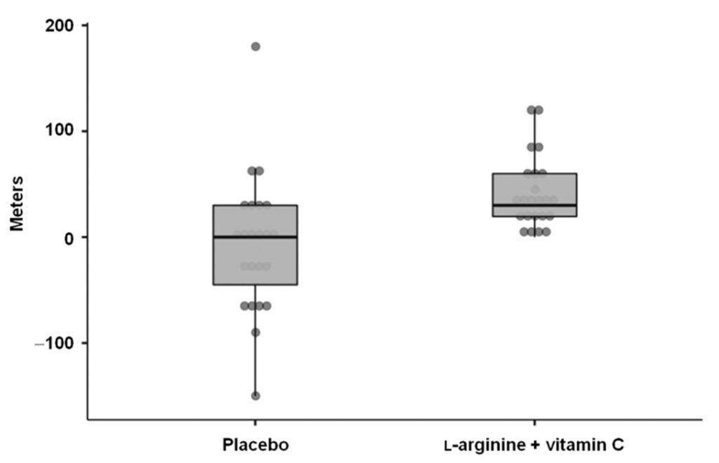 L-arginina plus vitamina C au crescut semnificativ distanța parcursă la testul de mers pe jos de 6 minute (modificare mediană (IQR) față de valoarea inițială: +30,0 (40,5) m) comparativ cu placebo (+0,0 (75,0) m; p = 0,001; medie diferență = 50 m, 95% CI: 20,0–80,0 m dimensiunea efectului = 0,56) (Figura 3).