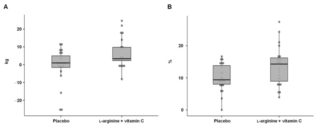 La 28 de zile, suplimentarea cu L-arginina plus vitamina C a indus imbunatatiri mai mari ale rezistentei gripului (+3,4 (7,5) kg) comparativ cu placebo (+1,0 (6,6) kg, p = 0,03; diferenta medie = 3,4 kg, 95% CI : 0,5–9,4 kg dimensiunea efectului = 0,37) (Figura 4A). La momentul inițial, aproximativ 60% dintre participanții la studiu aveau o putere a gripului sub cea de-a 25-a percentila a valorilor de referință specifice vârstei și sexului. După 28 de zile de intervenție, mai mulți participanți care au primit L-arginină plus vitamina C decât cei din grupul placebo (57% față de 30%) au fost peste primul quartil al valorilor de referință pentru rezistența gripului, deși diferența dintre grupuri nu a atins semnificația statistică (p = 0,07).