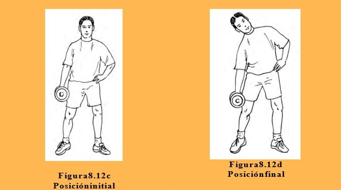 Tehnica de execuție: În picioare, cu picioarele ușor deparate și corpul în poziție anatomică. Efectuați flexia laterală a coloanei vertebrale. Expirați în faza concentrică și inspirați în faza excentrică a mișcării.