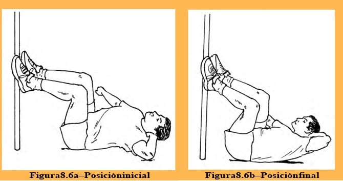 TEHNICA DE EXECUTIE: În decubit dorsal, cu picioarele susținute pe un perete sau pe un alt tip de suport vertical, cu o mână în spatele gâtului și cu cealaltă lângă trunchi (înclinată la 45 de grade) și articulațiile șoldului și genunchiului flexate la 90º. Efectuați o flexie în planul sagital, precum și o flexie laterală în planul frontal. Expirați în faza concentrică și inspirați în faza excentrică a mișcarii.