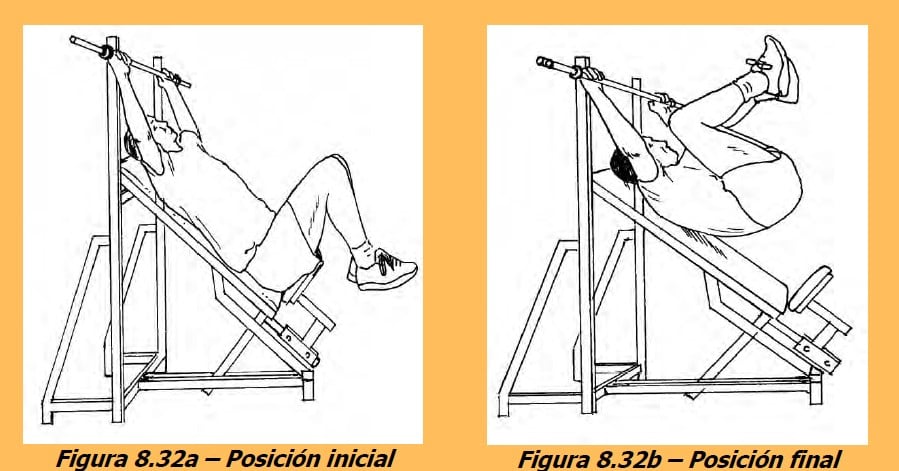 Tehnica de execuție: În suspensie pe o bară fixă, corpul este în decubit dorsal pe o bancă înclinată, trunchiul este sprijinit pe bancă, articulațiile șoldului și genunchiului flexate la aproximativ 90 °. Efectuați flexia coloanei vertebrale în plan sagital. Expirați în faza concentrică și inspirați în faza excentrică.