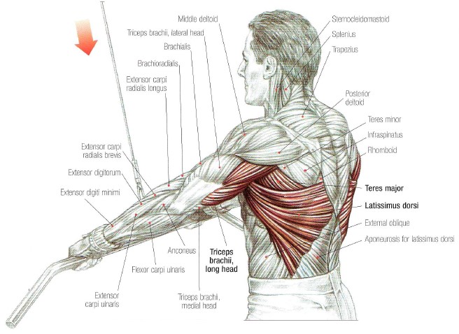 -Mușchii primari care mișcă articulația umărului sunt latissimus dorsi, teres major și partea inferioara a lui pectoralis major. Mușchii majori implicați în centura scapulară sunt rhomboid și pectoralis minor. Latissimus dorsi acoperă o zonă largă a spatelui. Tragerea în jos a brațelor extinse implică întreaga regiune, dar subliniază regiunea inferioară. Teres major lucrează cu latissimus dorsi și este situat pe suprafața externă a scapulelor (omoplații). În acest exercițiu, este implicată mai ales porțiunea inferioară (sternală) a lui pectoralis major.
