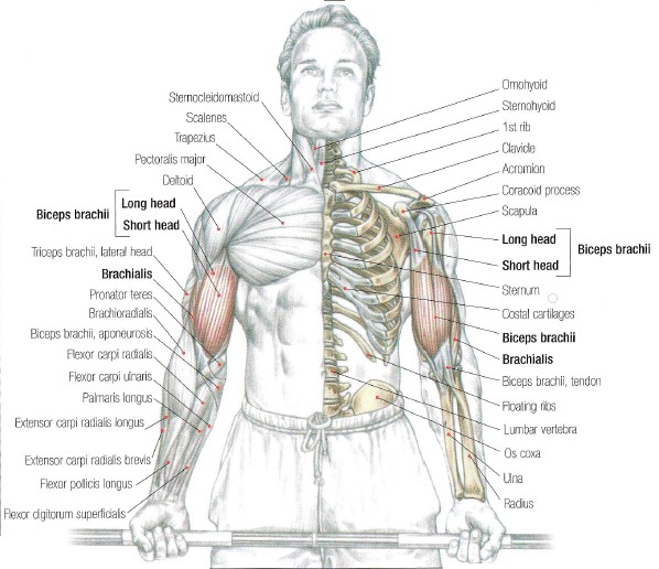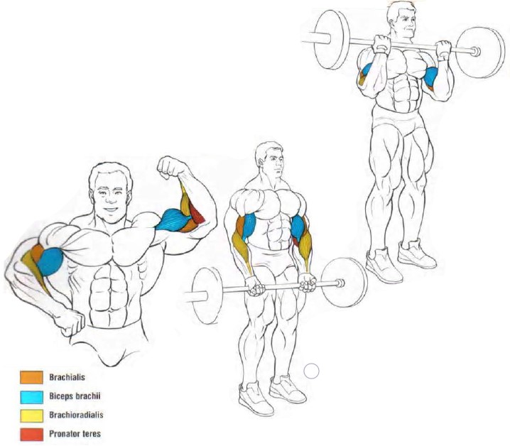 La flexia antebratului pe brat din picioare, bicepsul brahii și brahialis sunt ajutați de brahioradialis și pronator teres. Bicepsul este cel mai mare dintre acești mușchi și reprezintă cea mai mare parte anterioara a brațului superior. Are două secțiuni, un cap scurt și lung, ambele traversând articulațiile umărului și cotului. Brachialisul este situat sub biceps până la cot. Este puternic implicat în flexia cotului, indiferent de prinderea(priza) utilizată. Situat pe suprafața exterioară superioară a antebrațului pe partea degetului mare, brahioradialisul creează conturul rotunjit al antebrațului de la cot la degetul mare. Pronatorul teres intră în joc numai atunci când rezistența este suficient de mare. Se află anterior si oblic peste cot și este parțial acoperit de brahioradialis.