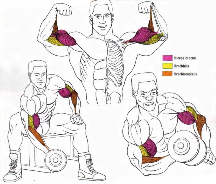 Bicepsul brachii are doua capete, capul lung și cel scurt, iar diviziunea dintre cele două poate fi văzută la culturistii care au o definiție bună.Situat între biceps brachii și humerus, lângă cot, brachialis este aproape la fel de implicat în miscarea de contrație.Pe suprafața exterioară a antebrațului, brachioradialis este probabil unul dintre cei mai mari mușchi din antebraț.