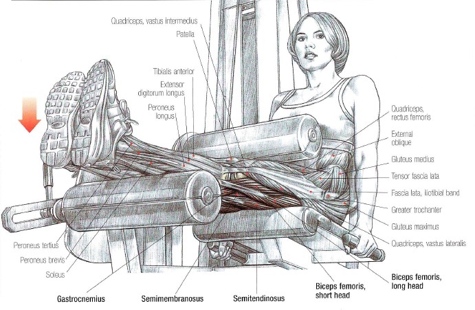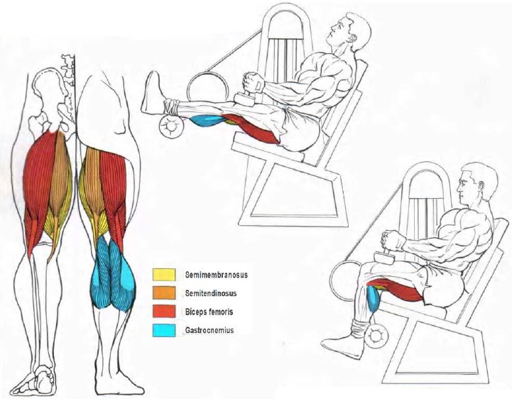 – Flexia articulației genunchiului este acțiunea majoră în acest exercițiu. În timpul execuției, partea posterioara a picioarelor (triceps surae/gambe) se deplasează mai aproape de partea posterioara a coapselor (ischio-gambieri/hamstrings), în timp ce coapsele rămân staționare. Bicepsul femural joacă cel mai mare rol în această mișcare datorită masei sale musculare relativ mai mari. Gastrocnemius joacă un rol puternic doar dacă aveți suficientă tensiune în mușchi, ținându-vă plantele(talpile) flexate în timpul execuției.