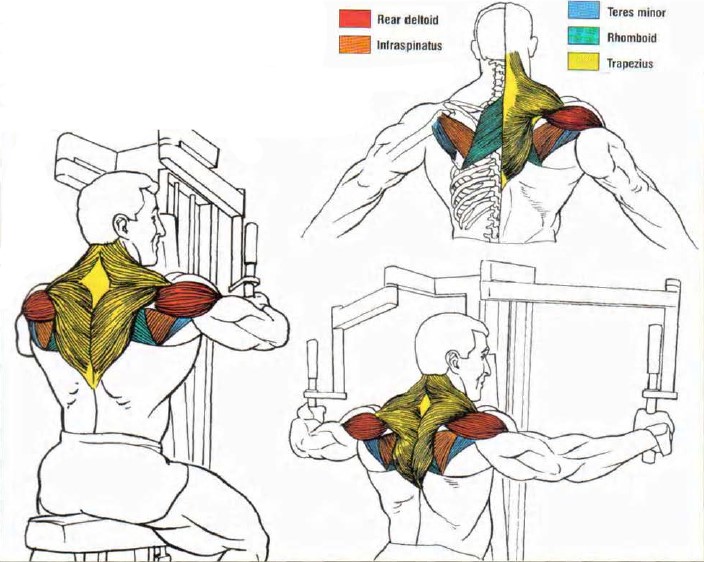 Rear Deltoid, Infraspinatus, Teres Minor, Rhomboid, Trapezius.