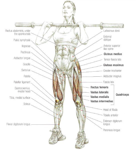 -Situat pe partea din față a coapsei, cvadricepsul include mușchii vastus lateralis, vastus medialis, vastus intermedius și rectus femoris. Vastus lateralis este situat pe partea exterioară a coapsei. Vastus medialis, cunoscut și sub numele de mușchiul lacrimă, se găsește pe partea interioara a coapsei. Cvadricepsul tău este puțin mai încordat în acest exercițiu din cauza poziției barei.