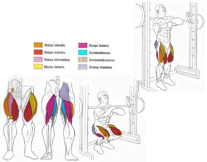 -Prin genuflexiunea profundă(executie joasa), ischio-gambierii (hamstrings)și gluteus maximus devin mai implicati. Ischio-gambierii, situati pe spatele coapsei, sunt compusi din biceps femoris(vastus longus, pentru ca vastus brevis nu este ischio-gambier), semitendinosus și semimembranosus. Gluteus maximus este cel mai mare și cel mai posterior mușchi al feselor.