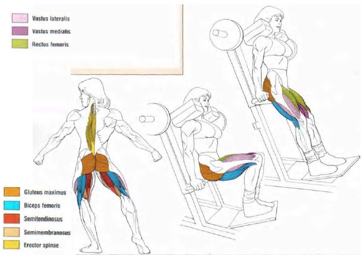 -Grupul muscular cvadriceps este implicat în extensia articulației genunchiului în care coapsa se îndepărtează de tibie. Gluteus maximus și ischio-gambierii sunt implicați în extensia articulației șoldului, în care coapsele se deplasează dintr-o poziție paralelă sau sub paralelă la verticală, aliniind centura pelviană și trunchiul cu picioarele. Mușchii erector spinae, în special în zona lombară, rămân sub contracție izometrică pentru a menține curbura normală a coloanei vertebrale.