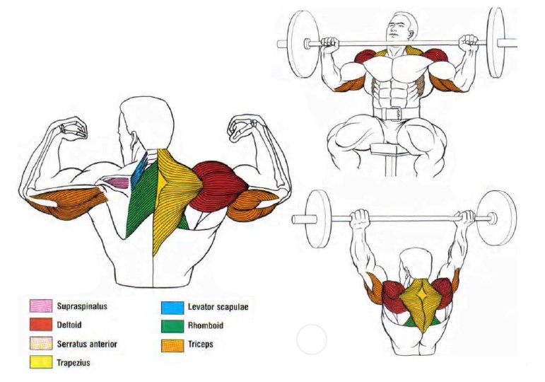 -Mișcarea omoplatului (scapula) după cum este necesar pentru întreaga gamă de mișcare, implică serratus anterior, trapezius superior și inferior, levator scapulae și rhomboid. Trapezius este un mușchi mare în mijlocul spatelui. Rhomboid este direct sub trapezius, în timp ce serratus anterior este situat în esență sub axile. Levator scapulae este un mușchi lung și subțire care trece de-a lungul părților din spate ale gâtului și este acoperit de trapezius superior.