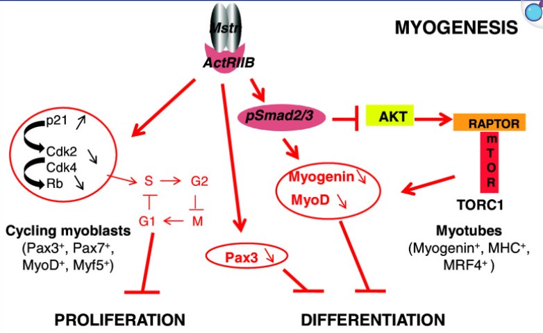 În timpul fazei de proliferare, miostatina poate crește nivelul p21, un inhibitor al kinazelor dependente de ciclină și, ca urmare, nivelurile CDK2, CDK4 și ale proteinei RB fosforilate scad, conducând la oprirea ciclului celular. Miostatina inhibă suplimentar diferențierea prin scăderea factorilor reglatorii miogenici, precum MyoD și miogenina, și a factorului de transcripție PAX3. Blocarea proteinei RAPTOR facilitează, de asemenea, inhibarea diferențierii musculare de către miostatină.