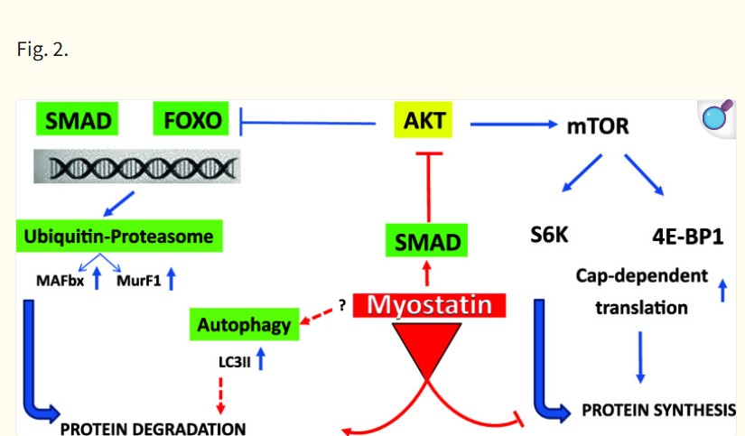 Mai întâi, calea miostatină–SMAD modifică activitatea kinazei proteice AKT, inhibând astfel asamblarea complexului de inițiere a translației și sinteza proteică. AKT blochează translocarea nucleară a FOXO pentru a inhiba exprimarea MAFbx și MuRF1 și, în consecință, degradarea proteinelor. În al doilea rând, miostatina suprimă și calea AKT și semnalează prin factorii de transcripție FOXO pentru a crește degradarea proteinelor prin activitatea sistemului ubiquitină–proteazom. În final, miostatina ar putea inhiba și sistemul autofagie–lizozom.