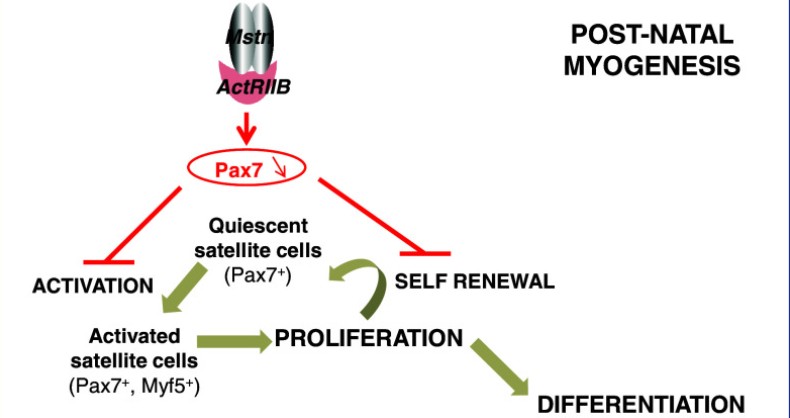 Miostatina contribuie, de asemenea, la inhibarea activării celulelor satelit și a auto-reînnoirii acestora în celulele musculare mature, prin scăderea factorului de transcripție PAX7.