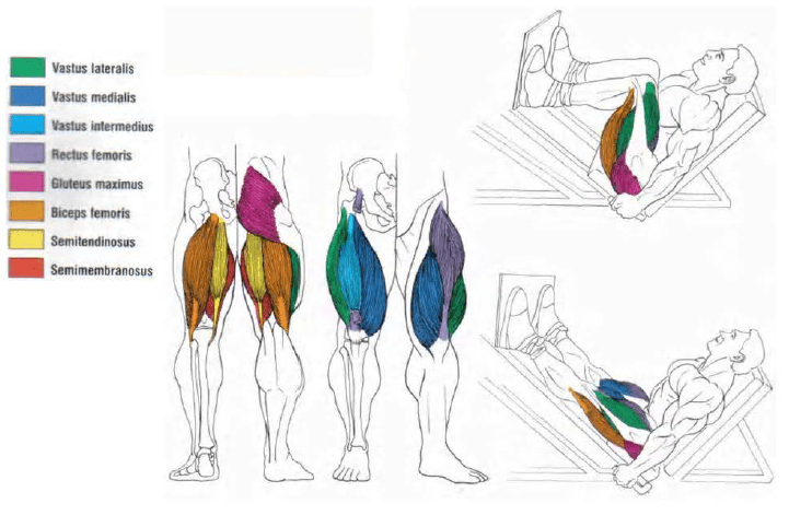 – Presa pentru picioare implică, de asemenea, un ușor grad de extensie a șoldului, care implică gluteus și ischio-gambierii(hamstrings). Gluteus maximus, unul dintre cei mai mari mușchi ai corpului, este situat în partea din spate a șoldului. Dintre cei trei mușchi ai ischio-gambieriilor(hamstrings) – biceps femoris, semitendinosus și semimembranosus – biceps femoris este cel mai mare și este de obicei cel mai bine definit mușchi al spatelui coapsei.