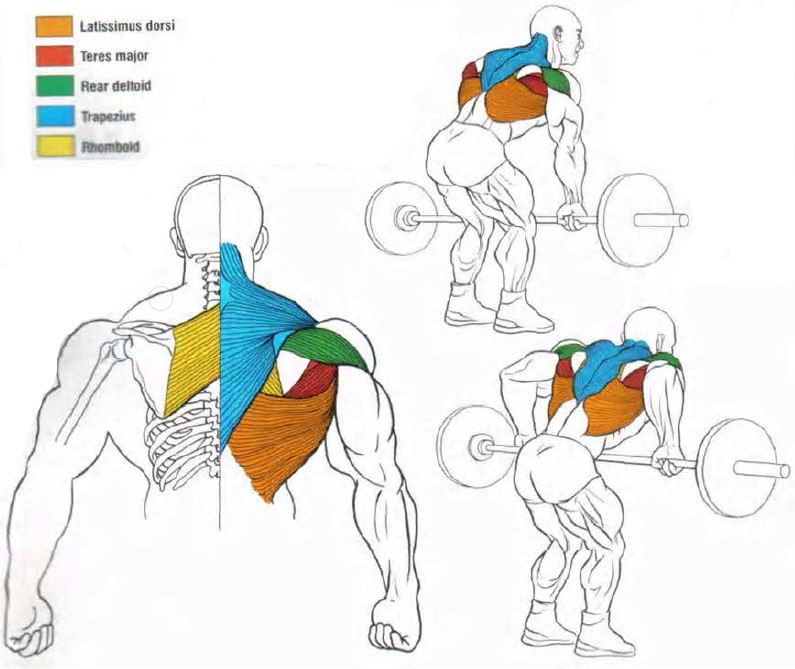 -Pentru a implica mai mult mușchii deltoid(vastus posterior), latissimus dorsi, rhomboid și trapezius mijlociu printr-o gamă completă de mișcări, țineți coatele în lateral și trageți bara mai mult spre piept (nu talie). Aceasta este o variantă mai dificilă și veți observa imediat implicarea diferită a mușchilor.