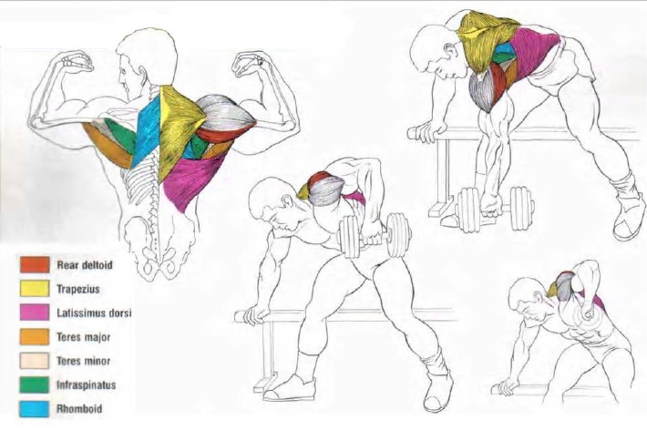 Rear Deltoid, Trapezius, Latissimus Dorsi, Teres Major, Teres Minor, Infraspinatus, Rhomboid.