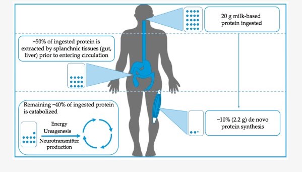 O cantitate disproporționată (față de compoziția proteinei ingerate) de aminoacizi eliberați din patul splanhnic în vena hepatică sunt prin urmare, BCAA. În general, ~50% din aminoacizii dintr-o masă care conține proteine sunt extrași de țesuturile splanhnice, în timp ce restul sunt eliberați în circulația plasmatică pentru utilizare extra-splanhnic. Deși mușchiul scheletic este un depozit mare pentru reținerea aminoacizilor, nu toți aminoacizii eliberați în plasmă sunt destinați să fie încorporați în noul țesut muscular scheletic. Într-un studiu recent care folosește o abordare a trasorului etichetat intrinsec, Groen și colegii săi au demonstrat că numai ~ 2,2 g sau 11% din aminoacizii furnizați bărbaților tineri într-un bolus de 20 g de cazeină au fost utilizați pentru sinteza proteinelor de novo, în ciuda ~55. % disponibilitate in circulatia periferica in urma extractiei splanhnice. Aminoacizii rămași sunt catabolizați și servesc drept substrat pentru o serie de procese metabolice de la producerea de energie și sinteza ureei și într-o măsură foarte mică, producția de neurotransmițători (a se vedea Figura 1 pentru o prezentare generală). Cu toate acestea, este important să recunoaștem că stările de boală, precum și vârsta pot modifica cinetica metabolismului aminoacizilor după ingestia de proteine. Cercetările viitoare ar trebui să se concentreze pe determinarea modului în care factori precum tipul proteinei, vârsta și eventual, microbiota intestinală interacționează pentru a influența împărțirea aminoacizilor și în special modul în care acești factori se schimbă în contextul exercițiului de rezistență.