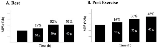 Figura 2. Creșterea MPS indusă de ingestia de proteine din zer la bărbați tineri, modificare procentuală de la 0 g. (A) În repaus, consumul a 10 g sau 20 g de proteine are ca rezultat o creștere de 19% și, respectiv, 52% de la 0g. Consumul a 40 g de proteine din zer nu are ca rezultat stimularea superioară a MPS dincolo de consumul de 20 g; (B) În urma exercițiilor de rezistență, consumul de 20 g de proteine crește MPS aproape de două ori mai mult decât consumul de 10 g, în timp ce consumul de 40 g de proteine din zer are ca rezultat o mică stimulare a MPS peste cea observată la 20 g, ceea ce indică faptul că există sunt randamente descrescătoare în ceea ce privește stimularea MPS peste 20 g. Date retrase de la Witard și colab., cu toate acestea, date similare sunt raportate de MacNaughton și colab. și Moore și colab.