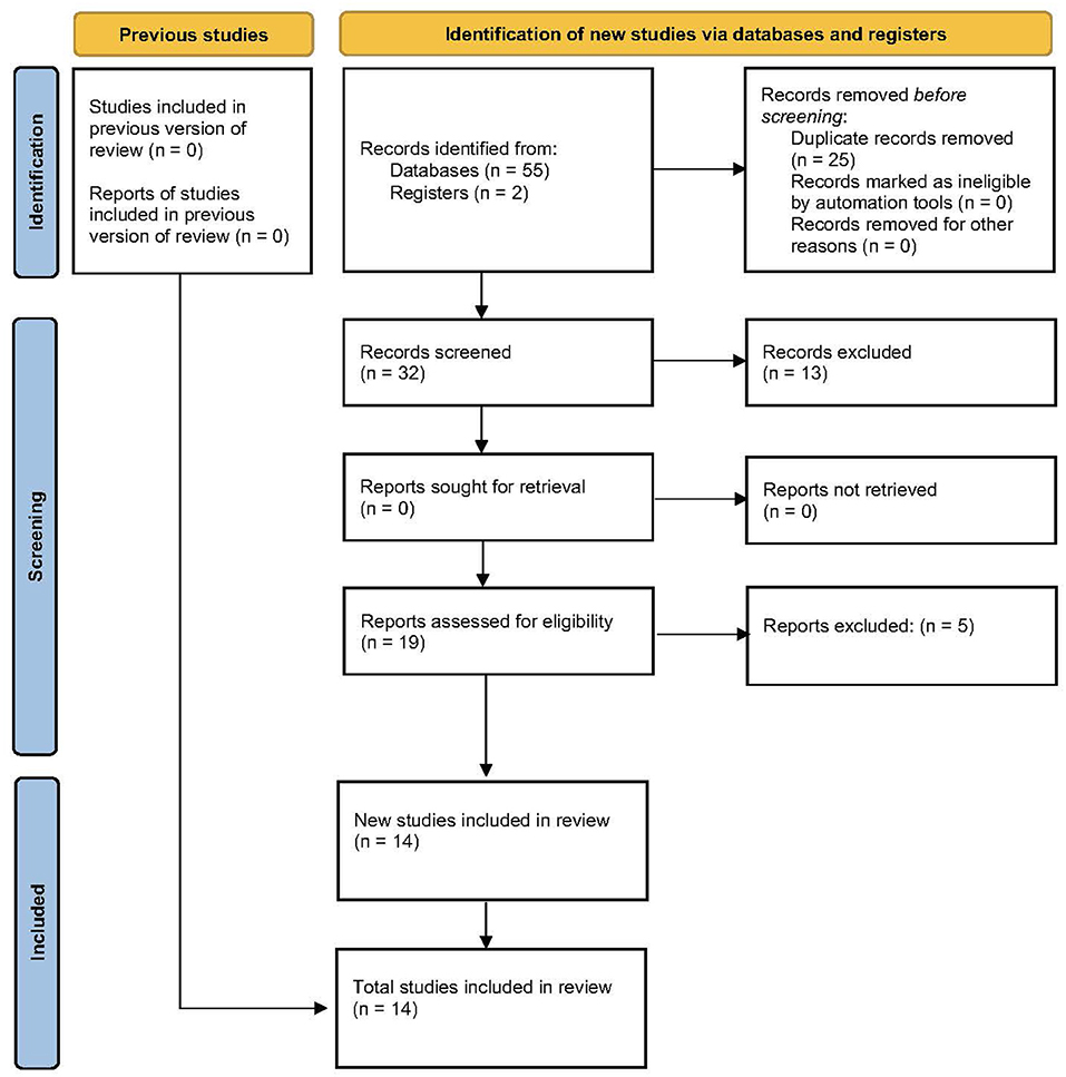 Figura 1 prezintă diagrama de flux a procesului de identificare a meta-analizelor urmat în această analiză de tip umbrella review. Căutarea inițială a identificat 55 de meta-analize, iar alte 2 meta-analize au fost identificate prin căutarea secundară. Ulterior, au fost eliminate 25 de înregistrări duplicate, iar 13 meta-analize au fost excluse pe baza titlurilor și sau a rezumatelor. Nouăsprezece meta-analize au fost analizate mai detaliat, în text integral, iar 14 meta-analize au fost incluse în analiza de tip umbrella review.