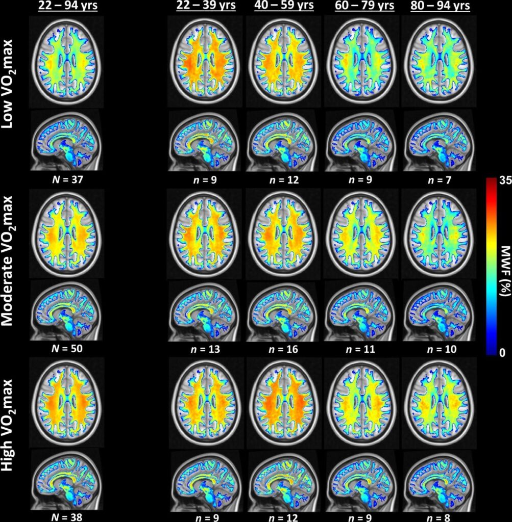 Pentru întregul grup de participanți, vârful mielinizării a avut loc în jurul vârstei de 31 de ani, după care nivelurile de mielină au început să scadă. Totuși, la participanții cu cel mai scăzut VO₂ max, nivelurile de mielină au atins un vârf înainte de vârsta de 22 de ani și au prezentat un declin mai rapid. Pentru participanții din grupul cu VO₂ max mediu, vârful mielinizării a avut loc la vârsta de 28 de ani, iar pentru participanții din grupul cu cel mai ridicat VO₂ max, vârful mielinizării nu a apărut până la vârsta de 41 de ani. Pe scurt, un nivel scăzut de fitness împiedică procesul de mielinizare în creier și determină o instalare mai timpurie și mai rapidă a deteriorării mielinei. Acest lucru nu este deloc benefic.