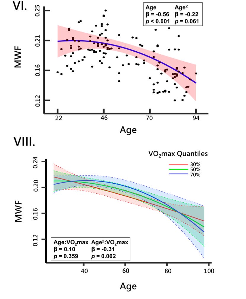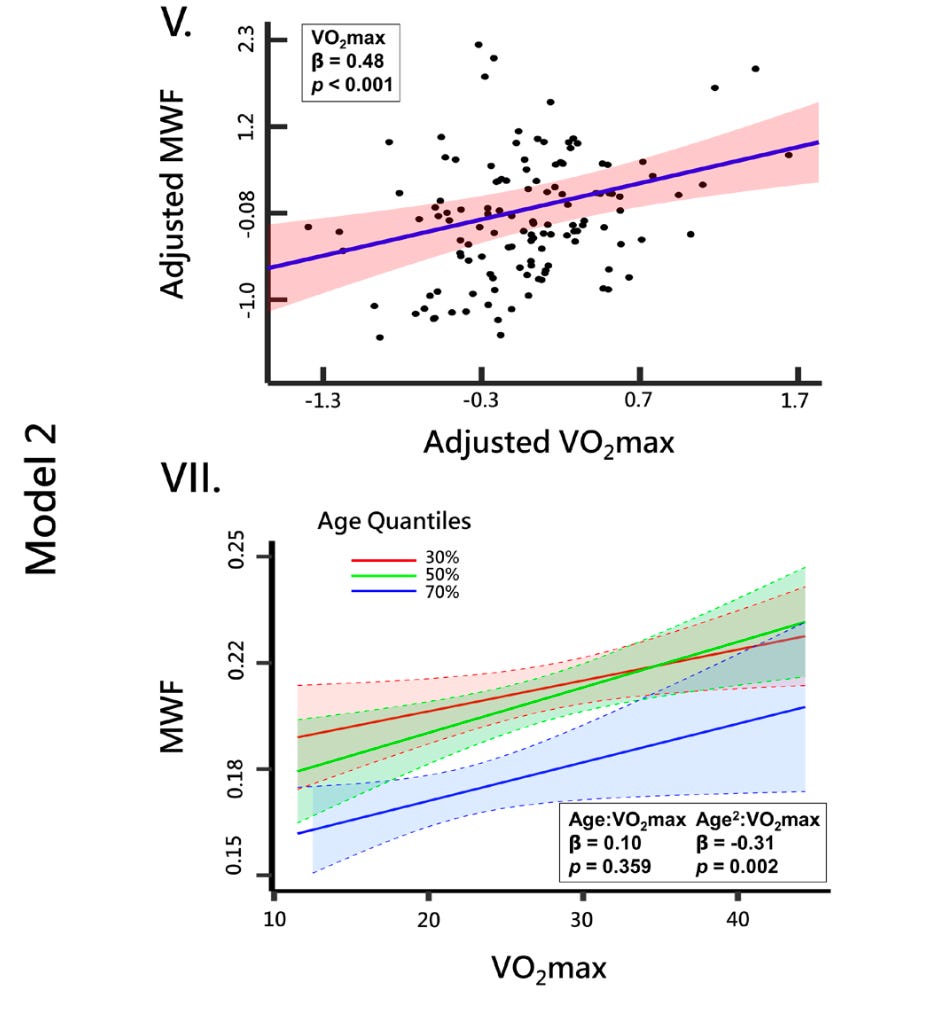 Așa cum se poate observa clar în imaginea de mai jos, participanții cu un VO₂ max mai scăzut aveau o mielinizare mai redusă, în timp ce cei cu un VO₂ max mai ridicat aveau o mielinizare mai mare. Acest lucru a fost cel mai evident în rândul participanților de vârstă mijlocie și înaintată, sugerând că fitnessul oferă o protecție și mai mare împotriva demielinizării cerebrale odată cu înaintarea în vârstă.